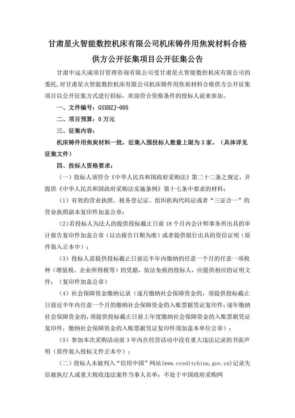 甘肅星火智能數控機床有限公司機床鑄件用焦炭材料合格供方公開征集項目公開征集公告